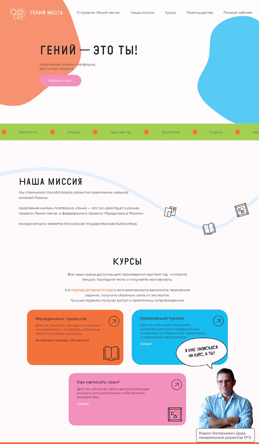 В этом году РГБ перезапустила «Гений — это ты!» в новом и доступном формате. Теперь это креативная онлайн-платформа, где читатели точек концентрации талантов могут пройти курсы по креативным индустриям и проектному менеджменту. Такая форма инициативы позволяет избавиться от ограничений по числу участников и даёт всем желающим возможность получить знания.