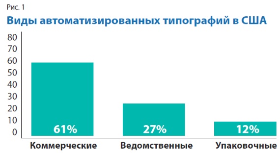 Если в своей прошлогодней статье «Зачем типографии АСУ?» («Университетская КНИГА», № 3 за 2019 год) я приводил множество доводов для руководителей издательско-полиграфических комплексов России и удивлялся их бездействию, то сейчас продолжу эту линию, опираясь на статистические данные американской полиграфической ассоциации NAPCO, крупнейшей в печатном мире. В её прошлогоднем опросе среди тысяч полиграфических предприятий Северной Америки приняли участие 650 типографий, успешно внедривших системы автоматизированного управления (АСУ) и технологии web-to-print для расчёта и оформления заказов через интернет-сайты. Среди этих автоматизированных предприятий 61% составили коммерческие типографии, 27% — ведомственные и 12% — упаковочные (рис. 1).