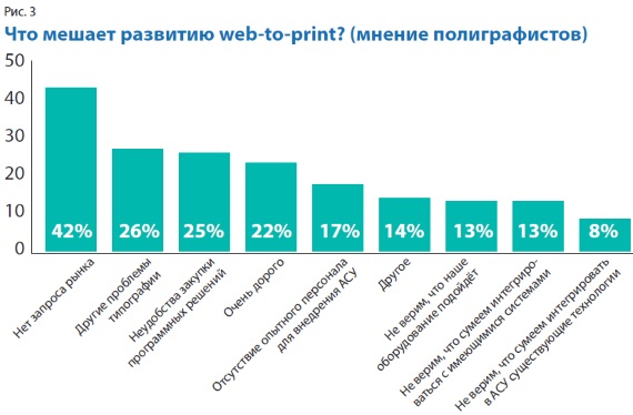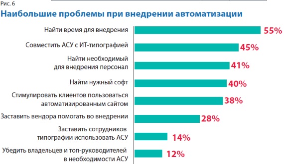 Анализ показывает, что более половины респондентов (55%) предпочитают определить правильный момент и решиться на внедрение. 38–45% испытывают сложности с интеграцией в АСУ уже имеющегося старого софта типографии, из-за отсутствия средств и опытного персонала для внедрения, а также с продвижением web-toprint-сайта на рынке. Замыкают список проблем недостаточность поддержки софта со стороны вендора (28%), нежелание сотрудников использовать новое ПО в своей работе (14%), отсутствие у владельцев мотивации к инвестициям в софт (12%).