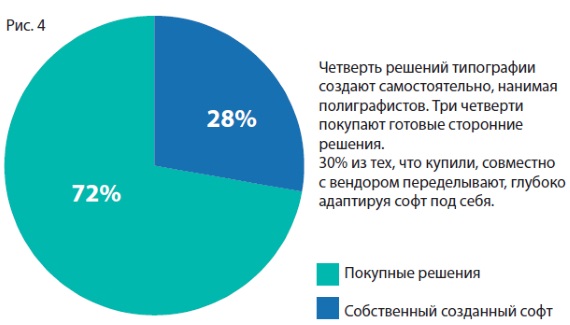 Имеет смысл прокомментировать данное распределение с учётом личного знакомства с опытом внедрения АСУ в российских типографиях и успешного опыта автоматизации типографий МГУ имени М.В. Ломоносова и НИУ ВШЭ. Конечно, лучшие решения получаются из самостоятельно написанных программ. В России к таковым, например, относятся АСУ лидера рынка фотопечати NetPrint, лидера цифровой печати книг Т8, крупнейшей типографии сборных тиражей «Группа М», цифровых типографий FastPrint, «Четыре цвета» и многих других. Основным же минусом их всех является дороговизна и существенные затраты времени как персонала, так и руководителей предприятий. NetPrint и Т8, например, пришлось потратить на свою автоматизацию 4–5 млн долларов и почти по десятку лет, пока софт не начал удовлетворять техническому заданию… Поэтому наиболее разумным может оказаться выбор покупного программного решения с глубокой адаптацией под действующие технологические и организационные процессы предприятия. Это сделает возможной автоматизацию уже отлаженных и привычных людям организационных и рабочих процессов, что будет способствовать быстрому обучению сотрудников и позволит максимально задействовать все ресурсы предприятия. Такие решения на рынке представлены, и полное внедрение может быть осуществлено за 0,5–1,5 млн рублей в течение 6–12 месяцев в зависимости от номенклатуры производимой продукции и величины типографии. В частности, таковым является ПО «Принт-Эксперт», успешно внедрённое в типографии НИУ ВШЭ, цифровой коммерческой типографии «Вишнёвый пирог», офсетной «Вива-Стар», на гибридных предприятиях «Мир пакетов» и «Дамми», а также ещё в ряде типографий России и ближнего зарубежья. Если же вы не уверены в своих силах или нет времени на отладку ПО, то можно использовать и готовые, «коробоч-ные», решения (например, такие, как АСУП «1С-полиграфия» от «Армекса», «А-Сис тем» от «Моноритма» или web-to-print-SaaS-софт PixlPark и т.п.), но в этом случае придётся менять и подстраивать под поставляемое ПО ценообразование, системы учёта и привычные технологические процессы типографии.