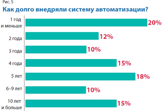 Американский опрос также показал, что среди тех, кому с успехом удалось преодолеть вышеназванные препятствия, четверть создали автоматизированные решения самостоятельно, наняв программистов и поставив им технические задания, а остальные довольствовались готовыми сторонними решениями (рис. 4). Следует также отметить, что заметная часть последних (30%) адаптировали софт под себя, совместно с поставщиком глубоко модернизировав изначальное ПО.