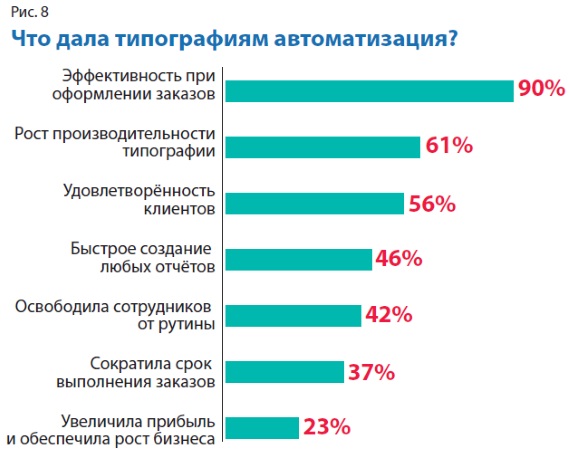 Очевидно, что пожелания типографий в основном исполнились, разве что материальной отдачи от автоматизации, повышения оперативности выполнения работ и сокращения рутинных операций им хотелось ещё больше. Зато эффективность и производительность типографии, а также степень удовлетворённости клиентов (иначе говоря, имидж предприятия) возросли после автоматизации в достаточном объёме.