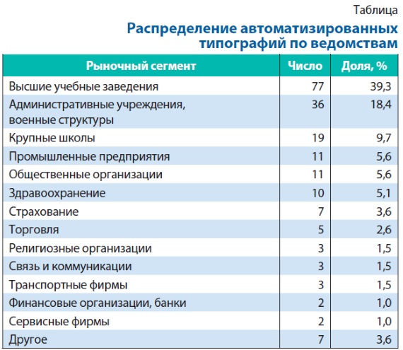 Наибольшее количество внедрённых АСУ приходится на вузовские типографии (77 предприятий), далее следуют органы муниципального управления и военные структуры (36), крупные школы (19), отделы печати заводов и благотворительных организаций (по 11), больницы (10), страховые компании (7) и другие ведомства со своими типографскими участками. В России, увы, таких автоматизированных типографий нет вообще. Это, с одной стороны, удручает, а с другой — показывает прекрасный потенциал для развития ведомственных полиграфических отделов. Может быть, наступающий кризис подтолкнёт их к повышению эффективности своей работы, сокращению издержек и внедрению платных услуг для физических и юридических лиц, что невозможно без внедрения АСУ.