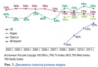 С 2002 г. аудитория Интернета росла взрывообразно. При этом среди остальных медиа не наблюдался сопоставимый уровень падения читательского внимания (рис. 1). Таким образом, люди используют Интернет как ещё один источник информации, а не как заменитель традиционных медиа.