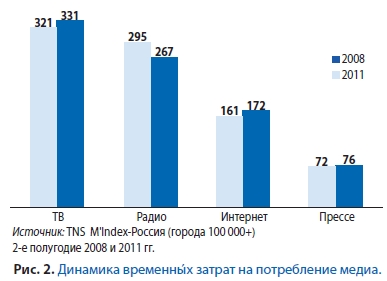 Интересно, что снижение абсолютного времени, в течение которого человек использует традиционные медиа, незначительно (рис. 2). Это говорит о том, что основной рост времени в Интернете идёт за счёт снижения других способов проведения досуга, а не за счёт замещения ТВ, газет, журналов и радио.