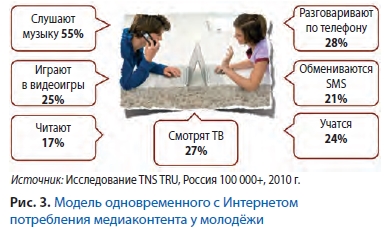 Какой же станет газета будущего? Всё зависит от социального запроса молодого поколения, тех, кому сейчас от 12 до 24 лет. А они выросли в совершенно иной медиа-среде, чем мы. Они живут в социальных сетях и блогах, активно используют все мобильные ресурсы – смартфоны, мобильный Интернет, смотрят видео, совершаютпокупки в Сети и привыкли к параллельному потреблению медиаконтента (рис. 3). Поэтому газета будущего неизбежно перейдёт в электронный формат, и приложения для планшетов – это пока всего лишь прототип возможного разнообразия форматов. Новое медиа должно отвечать таким критериям, как удобство для пользователя, низкая стоимость, большой объём информации, оперативное обновление, лёгкая дистрибуция и неограниченные возможности для рекламодателей.