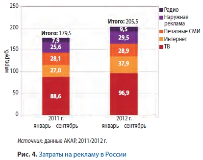 Затраты на рекламу в России в 2012 г. по сравнению с 2011 г. выросли на 26 млрд рублей и составили 205,5 млрд рублей. При этом если показатели по телевидению и Интернету выросли, то по печатной прессе – практически не изменились (рис. 4).