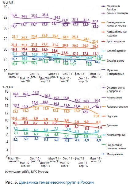 — Этот процесс в меру цикличен: когда в стране возникают какие-то политические проблемы, резко возрастает интерес к общественно-политическим изданиям. За последние годы в Москве значительно вырос сегмент кулинарных изданий, стало модным готовить дома, и появилось много новых проектов, как российских, так и зарубежных, их аудитория продолжает расти. В период кризиса достаточно активным был интерес к различным прикладным изданиям типа «сделай сам», особенно к недорогим изданиям. Недавно запущено несколько телегидов. Женские и мужские издания – традиционно стабильные сегменты, там много игроков. Детский сегмент менее активен, у них сложная ситуация с распространением, есть ограничения на размещение рек ламы. Ещё хуже обстоят дела с подростковыми и молодёжными изданиями.