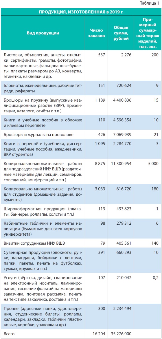 Ассортимент производимой типографией НИУ ВШЭ печатной продукции огромен: на нашем сайте print.hse.ru представлена информация о полусотне различных видов полиграфических изделий с возможностью автоматического расчёта их стоимости и заказа. Приводим фактические данные по изготовленной в 2019 г. продукции (табл. 1).