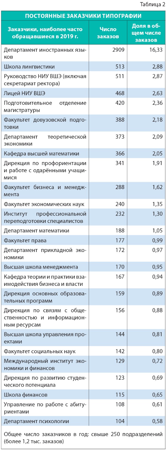 В 2019 г. в типографию НИУ ВШЭ обратились 276 разных организаций, из них подавляющее большинство составили подразделения университета. Заказы оказались распределены равномерно по подразделениям, и лидер (издательский дом) занял всего 5,3% финансового оборота типографии. В табл. 2 представлены постоянные заказчики, обратившиеся в типографию более ста раз за год.