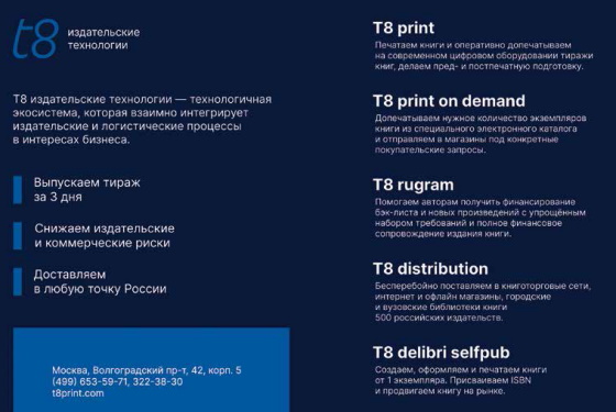 Полный издательский цикл от Т8 — это шаг в будущее, где наши клиенты всегда довольны выпуском книги и знают, кому доверить своё следующее произведение.