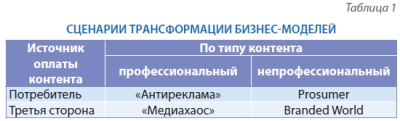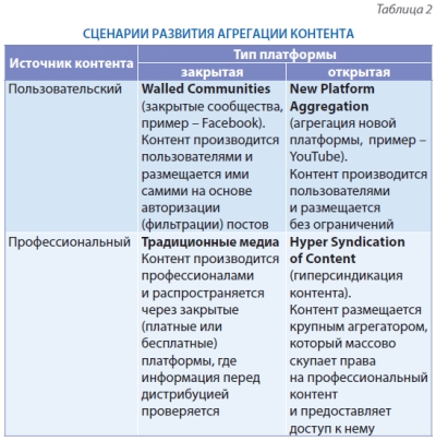 Институт IBM классифицировал возможные сценарии по двум основаниям: типу платформы – закрытая, когда есть некий фильтр входящего контента, и открытая, когда пользователи могут самостоятельно загружать контент; и источнику контента – профессиональный медийный или пользовательский. Таким образом, существуют четыре сценария развития (табл. 2).