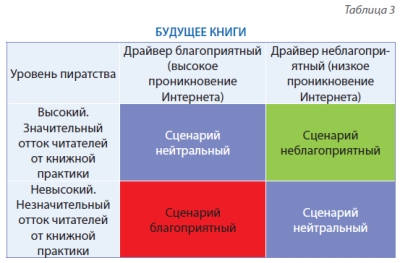 Итак, наиболее значимой для отрасли и позитивной тенденцией является рост проникновения Интернета, а наиболее значимый негативный тренд – пиратство. На основе анализа пересечения этих факторов возможны несколько сценариев. Первый – при котором высокий уровень проникновения Интернета сочетается с высоким уровнем пиратства, второй – низкий уровень пиратства и высокий уровень проникновения Интернета (положительный сценарий), и неблагоприятный сценарий, когда проникновение Интернета низкое, а уровень пиратства может быть любым (табл. 3).