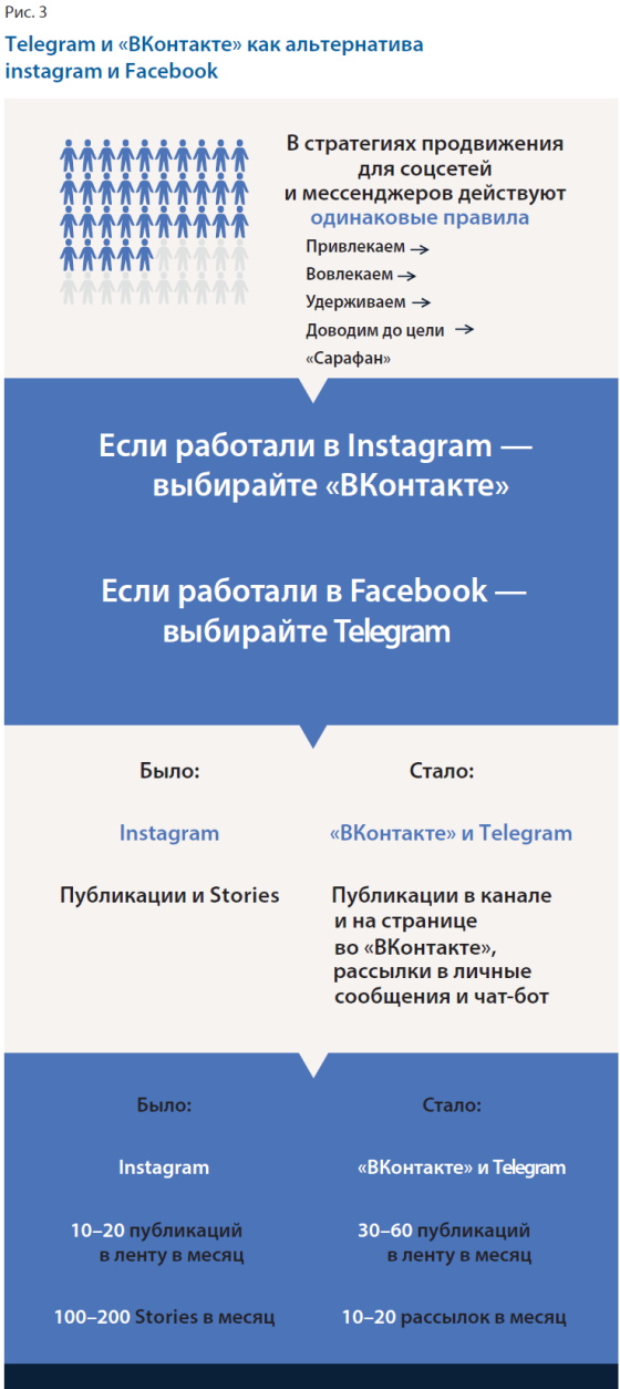 Наиболее близким инструментом по возможностям к Instagram будет «ВКонтакте». Сейчас заметен тренд на переход блогеров из Instagram в Telegram, но это существенно различающиеся по инструментарию площадки. Мессенджер служит другим целям. Заваленный сообщениями, он не даёт эффекта. Велика вероятность того, что в скором времени блогеры перейдут со своей аудиторией в соцсеть «ВКонтакте». Вряд ли вас обрадует обросший спамом поток сообщений в мессенджере «ВКонтакте» и СМС от разных организаций, с Telegram — так же.