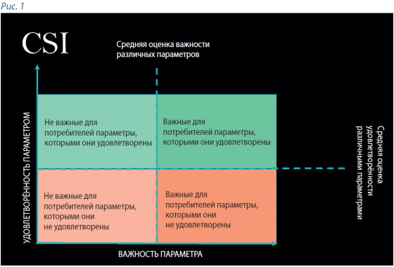 По словам выступающего, прежде всего необходимо определить предиктор, т.е. найти то, что влияет на успех. Для начала можно посчитать два показателя: CSI и NPS. Customer Satisfaction index (CSI) — индекс удовлетворённости клиентов. Net Promoter Score (NPS) — индекс лояльности. CSI позволяет понять, насколько довольны потребители различными параметрами продукта или услуги, выяснить, какие параметры являются для человека важными и он ими удовлетворён, качество каких его не устраивает и т.д. (рис. 1).