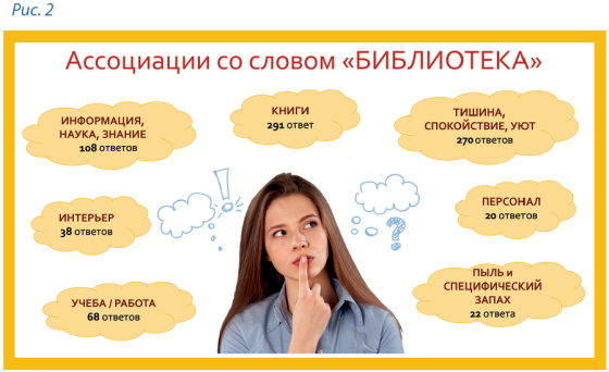 Как показал анализ, большинство респондентов (291) ассоциируют понятие «библиотека» с книгами, 270 — с тишиной, спокойствием, уютом, 108 — с информацией, наукой, знанием (рис. 2). Следует отметить, что за последнее время основная часть опрошенных посещала университетскую библиотеку.