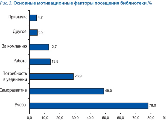 К числу основных факторов мотивации респондентов к посещению библиотек относятся учёба, саморазвитие, а также потребность в уединении (рис. 3).