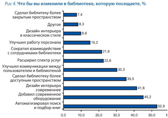 Как показывает анализ данных, представленных на рис. 4, более половины респондентов хотели бы автоматизировать поиск и подбор литературы, 45,2% — добавить современное оборудование, 41,6% — модернизировать интерьер, 35,6% — сделать библиотеку более доступной, 30,3% — усовершенствовать коммуникации. Оптимизация процессов поиска и подбора информации и литературы с помощью цифровых технологий и современного оборудования позволит экономить время, — делает вывод эксперт.