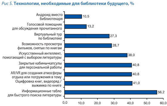 Рисунок 5 иллюстрирует представления респондентов о технологиях библиотеки будущего. По мнению опрошенных, в такой библиотеке должны быть информационные табло для быстрого поиска книг, технологии виртуальной и дополненной реальностей, алгоритмы искусственного интеллекта. Оперативный поиск литературы является актуальной задачей, которую необходимо решать с помощью технологий, — подчеркнула выступающая.