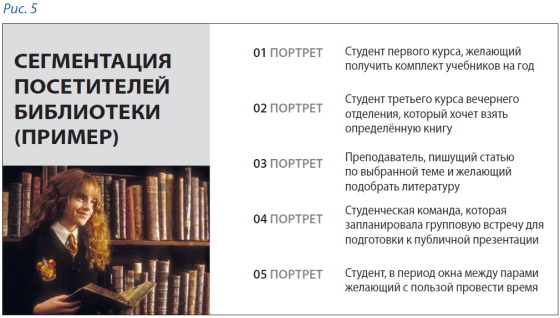 Поскольку библиотека перестала восприниматься как книгохранилище, современный посетитель не обязательно является читателем в традиционном смысле этого слова. В связи с этим нельзя оставаться в традиционных рамках разделения посетителей библиотеки на студентов и преподавателей. Одним из главных параметров становится пользовательская задача: зачем посетитель пришёл в библиотеку и кто он? Исходя из этого можно разработать типовые сценарии поведения и взаимодействия, чтобы сделать решение задачи проще, быстрее и эффективнее. В частности, эксперт предлагает вариант сегментации, представленный на рис. 5.