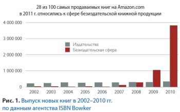 Смакование тяжёлого положения издательств сопровождается множеством разговоров, и не беспочвенных, о самопубликующихся авторах. Достаточно посмотреть на отчёты R. R. Bowker – компании, отвечающей за распространение ISBN в США, за последнее десятилетие, чтобы увидеть, что количество наименований выросло более чем в десять раз, причём выпуск традиционных издательств не увеличился (рис. 1). То есть цунами самопубликаций, кажется, накрыло издательскую отрасль. Вот только книги у большинства из них, независимо от качества текста, выглядят ужасающе – и не их в том вина. Они ведь не специалисты. Просто отверженные нами, издателями, авторы. Причём, что характерно, те из них, кто добивается успеха, несмотря ни на что, заключают договора с издателями. Потому что они хотят писать, а не заниматься реализацией и продвижением.