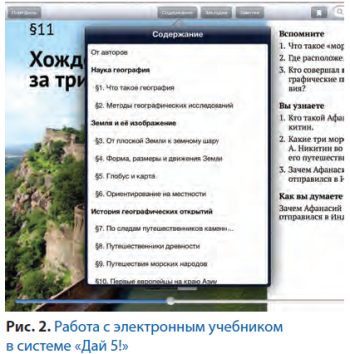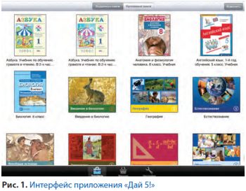 В «Дай 5!» пользователь получает сразу два варианта доступа к контенту (сейчас это учебники в форматах pdf или ePub) – через магазин контента, а также после «привязки» планшета и пользователя к классу и школе – к школьной библиотеке лицензий. И приобретённые, и выданные электронным библиотекарем бесплатные для учащегося учебники попадают в виртуальный портфель на планшете. Интерфейс приложения максимально прост и позволяет видеть всю доступную литературу на экране (рис. 1). Нажатие на интересующую обложку приводит к запуску соответствующей электронной книги (рис. 2).