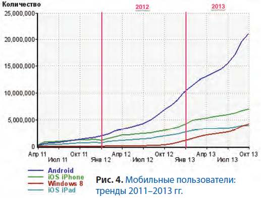 Основной тренд Рунета – всеобщая мобилизация. Планшеты остаются самой быстрорастущей категорией персональной электроники в России. Согласно исследованиям ритейлера «Связной», в 2013 г. продажи этих устройств составили 7,2 млн штук, что на 125% выше показателя 2012 г. Учитывая предыдущие годы, пользовательский рынок можно оценивать уже в десятки миллионов штук. В денежном выражении продажи планшетов увеличились на 65% – до 81,4 млрд рублей.