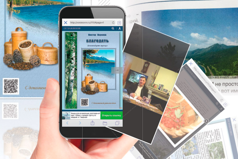 QR-код — это разновидность штрих-кода, с помощью которого легко можно получить какую-либо информацию (текст, ссылку на сайт и т.п.). Достаточно установить программу, считывающую QR-коды, например QR Code Reader или Barcode Scanner. Они, кстати, довольно широко распространены в повседневной жизни. Затем за пускаем приложение, подносим устройство к картинке с кодом, дожидаемся фокусировки — и считанная информация появится на экране. Это электронная книга, которая всегда под рукой. Цифровые издания популярны, ими сейчас никого не удивить, но плюс в том, что не нужно отдельно искать, скачивать; один клик — и можно смело оставить бумажную версию дома, а чтение продолжить в любом месте. По данным статистики, в нашей стране люди пока ещё отдают предпочтение бумажным книгам: тактильные ощущения, перелистывание страниц. Любимое издание хочется подержать в руках, сделать пометки карандашом. Но стремительный темп жизни диктует свои правила, и цифровой формат становится незаменимым. Книга с дополненной реальностью сможет удовлетворить интересы обеих сторон, это некий вариант «два в одном» плюс бонус. В случае «Благодати» В.В. Воронова бонусом становятся литературные чтения, фоторяды, карты и видео с автором.