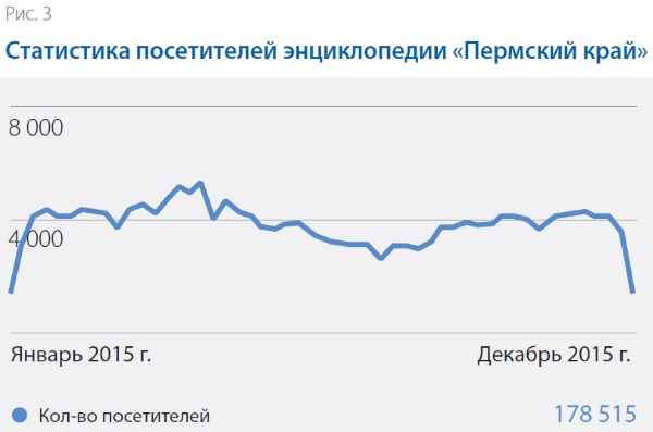 Энциклопедию «Пермский край» в год посещают 178 тыс. человек, которые просматривают 405 тыс. страниц (рис. 3). Но если бы эта энциклопедия была выпущена в виде печатного издания и опубликована на сайте в формате pdf, достичь такой посещаемости она бы не смогла.