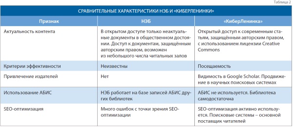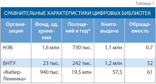 Сегодня самым крупным проектом из созданных библиотекарями является НЭБ. При объёме фонда в 1,6 млн единиц хранения ресурс в 2015 г. посетили около 730 тыс. пользователей (2 тыс. посетителей в сутки). Казалось бы, немало, но давайте сравним с другими библиотеками (табл. 1).
