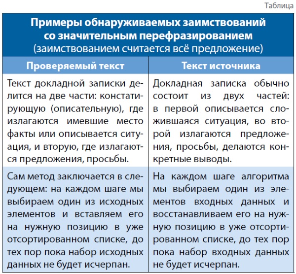 Чаще всего преподаватели не имеют возможности вручную искать первоисточник. Немногие знают, что в отличие от большинства систем, которые просто «прогоняют» дипломную работу по своим базам, «Руконтекст», созданный Институтом системного анализа РАН совместно с консорциумом «Контекстум», уже обучен лингвистическому анализу текстов (табл.); теперь изучают возможность проверки иноязычных источников.