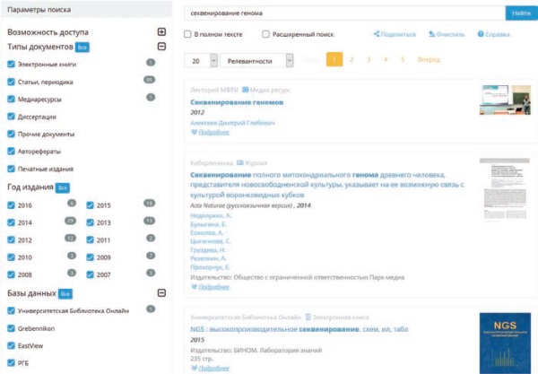 Основная форма поиска — это, конечно, единая строка, интегрированная с сайтом библиотеки. Для русского и английского языков работает морфологический поиск и поддерживается расширенный синтаксис поисковых запросов, похожий на тот, что применяется в «Яндексе». Есть возможность сохранить результаты поиска или поделиться ими в социальных сетях. По самым значимым научным источникам, таким как ЭБД РГБ, НЭБ, Научный архив и «КиберЛенинка», работает полнотекстовый поиск, что является эксклюзивной особенностью «Библиопоиска». Имеются фасетные фильтры, ставшие де факто стандартом библиотечных поисковых систем. Не забыта и расширенная форма с вполне привычными поисковыми функциями. Разработчики «Библиопоиска» старались создать систему, максимально похожую на стандартные интернет-поисковики, и можно сказать, что они в достаточной степени преуспели в этом. По умолчанию сортировка поисковой выдачи производится по релевантности, о чём следует рассказать отдельно.