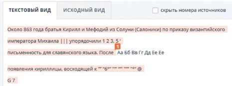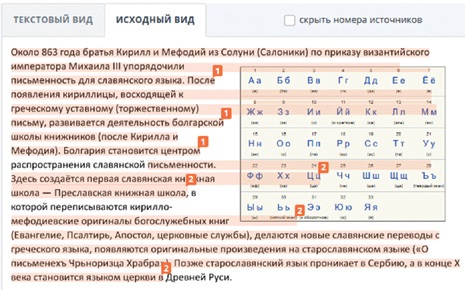 Ещё одним побочным эффектом можно считать появление случайных символов, возникающих при распознавании иллюстраций. Рассмотрим пример с фрагментом статьи о русском алфавите из «Википедии» [2]. Из первого абзаца этой статьи и таблицы с алфавитом был подготовлен документ, исходный вид которого представлен на рис. 1 в формате отчёта о заимствовании системы «Антиплагиат.ВУЗ».