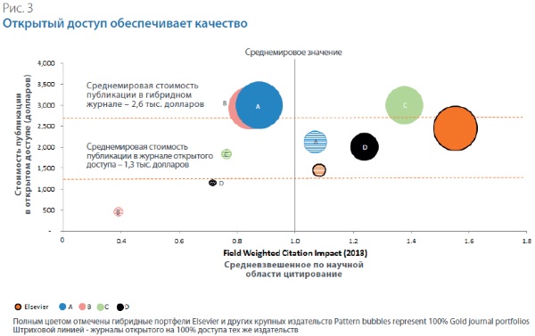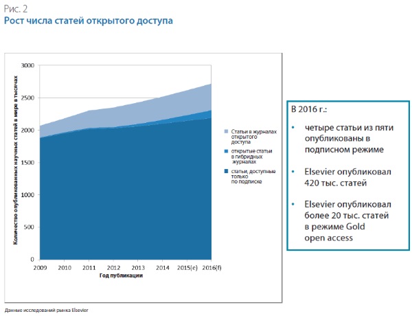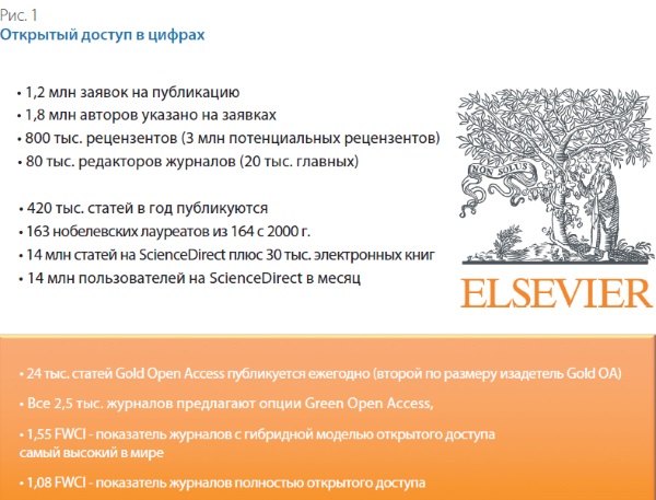 Сейчас такую опцию предлагают более 1,5 тыс. подписных журналов Elsevier. Ежегодно в гибридных журналах издательства публикуется свыше 24 тыс. статей в открытом доступе. Оценивая уровень цитирования, следует отметить, что средневзвешенный по области показатель цитирования (Field Weighted Citation Impact, FWCI, рассчитывается в Scopus), на мировом уровне равный единице, для всех журналов открытого доступа находится на уровне 0,9, а для открытых публикаций в гибридных журналах Elsevier составляет 1,55.
