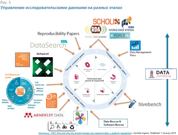 Компания Elsevier ведёт более 10 проектов в области распространения данных исследований, являясь активным участником проектов Research Data Alliance (www.rd-alliance.org), который реализует социальные и технические инициативы для обеспечения открытого обмена данными; Force11 (www.force11.org ), объединяющего учёных и библиотеки для реализации новых принципов работы с данными; и National Data Service (www.nationaldataservice.org), который связывает инициативы по архивированию и распространению данных с доступными инструментами и программным обеспечением.