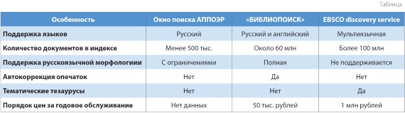 В таблице выше приведена сравнительная характеристика распространённых в России библиотечных поисковых сервисов.