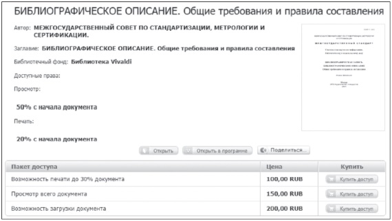 Она обратно совместима со второй и содержит небольшое дополнение — платные пакеты доступа. В тот момент, когда сервер РНБ запрашивает права доступа, сервис выдачи издательства вместе со списком прав высылает перечень дополнительных опций, которые читатель может приобрести за деньги. С использованием этого механизма правообладатель вправе реализовать, например, следующий сценарий: предоставить возможность читателю бесплатно ознакомиться с оглавлением, а полный доступ к книге получить на платной основе. Читатель будет видеть весь спектр доступных ему опций, как платных, так и бесплатных (рис. 2).