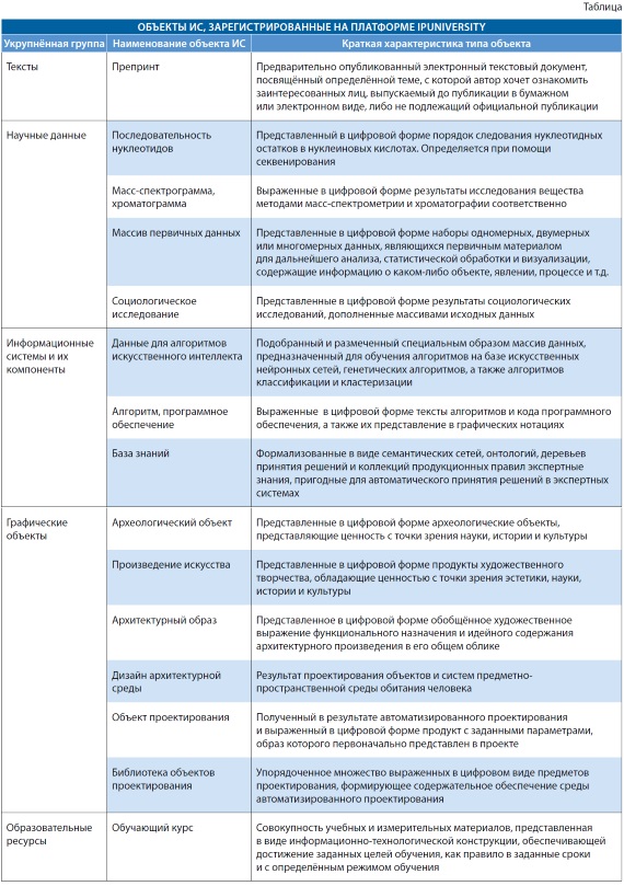 Цифровая платформа IPUniveristy в настоящий момент охватывает 15 типов объектов ИС, представленных в таблице.