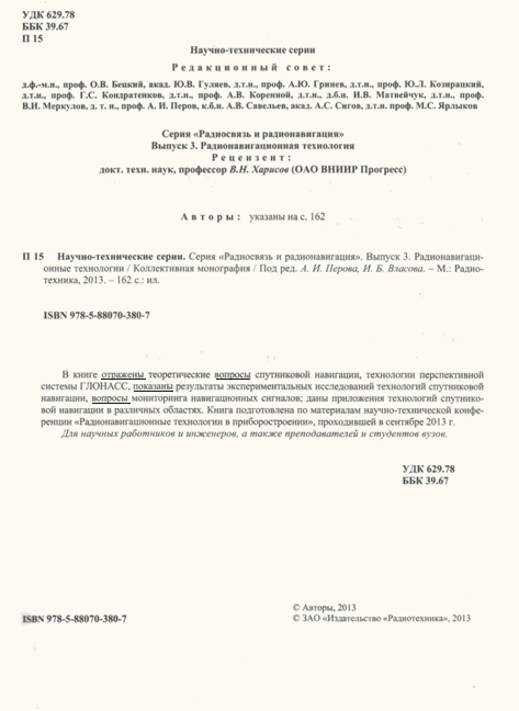 Я стала уточнять сведения об этой книге в Интернете. Она выпущена под редакцией д-ра техн. наук А.И. Петрова и д-ра техн. наук И.Б. Власова. Совпадают все сведения, данные издательством, кроме фамилии одного из редакторов. В этой области (радионавигационные технологии) широко известны имена учёных А.И. Перова, В.Н. Харисова, И.Б. Власова и др. Но не А.И. Петрова. Таким образом, для читателя описание книги в Сети — ложный путь.