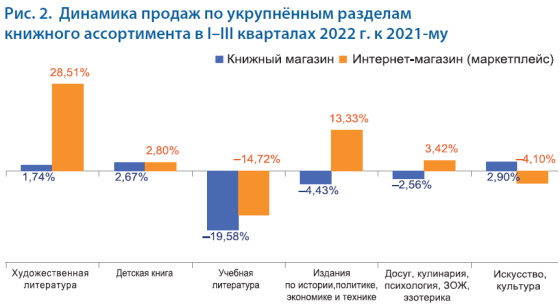 В марте — сентябре 2022 г. книжные магазины фиксируют снижение спроса на книги по досугу, медицине, экономике и на зарубежную литературу, представленную на языке оригинала. И напротив, наблюдают определённый рост интереса покупателей к художественной литературе, биографической прозе, комиксам и детской книге, а также к изданиям по вопросам истории. В августе — сентябре 2022 г. средний чек книжных магазинов в Москве поднялся до 1619,3 рубля (+24,8% к 2021-му).