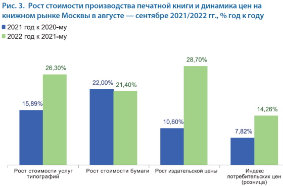 В сентябре 2022 г. стоимость типографских услуг и бумаги в среднем выросла в сравнении с сентябрём 2021-го на 26,3 и 21,4% соответственно. А учитывая тот факт, что доля типографских расходов в структуре себестоимости книжного издания находится в среднем на уровне 68%, то вполне очевиден и порядок роста отпускных цен даже при переходе издательства в режим максимальной экономии. В августе — сентябре 2022 г. новые книги поступали в книжные магазины Москвы по цене на 18–30% дороже, чем годом ранее. И это касается только прямых поставок от издательств, в то время как прайсы московских оптовиков («Лабиринта», «Абриса») и поставщиков книг на языке оригинала выросли на 50–0%. Ни книжные магазины, ни издатели не готовы жертвовать маржинальностью бизнеса. И по оценкам экспертов, в IV квартале 2022 г. издательская цена новой книги увеличится ещё на 9–5% (рис. 3).
