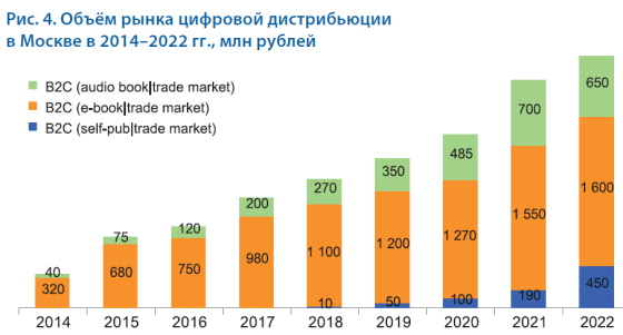 Согласно экспертной оценке, объём московского рынка электронных (текстовых и аудио-) книг, включая самиздат-проекты, в январе —августе 2022 г. составил 2,1 млрд рублей при темпах роста к аналогичному периоду 2021-го в 2,88%. В годовом исчислении объём столичного рынка прогнозируется на уровне 2,5–,6 млрд рублей (+6,5% к итогам 2021 г.), т.е. его годовые темпы прироста сократятся в четыре раза (рис 4).