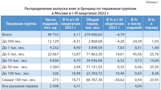 В 2022 г. столичный книжный выпуск вырос по всем тиражным группам, кроме малотиражных (до 500 экз.) изданий (табл. 1). Самые большие показатели — по книгам и брошюрам, тиражируемым в диапазоне 51–100 тыс. экз.: +19% по числу наименований и +19,4% по суммарному тиражу, при этом можно видеть существенные масштабы снижения экземплярности в группе брошюр, тиражированных в количестве свыше 100 тыс. экз.: –30,6%. В традиционных книжных группах изданий с тиражом от 1 до 50 тыс. экз. динамика более скромная, но положительная (2,9–14%). В I–III кварталах 2022 г. сохраняется структура книжного выпуска по тиражным группам 2021-го: столичные издатели в основном инвестируют в производство книг с тиражом от 1 до 5 тыс. экз. (45,6% выпуска), в то время как в 2019–2020 гг. основной массив инвестиций приходился на издания с тиражом в 5–10 тыс. экз.