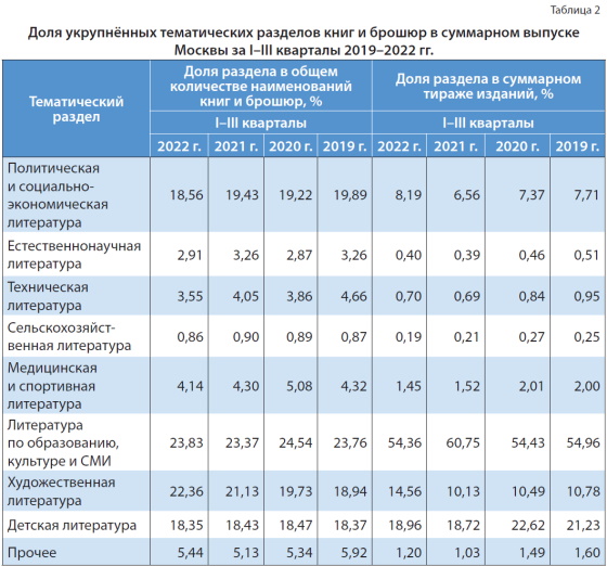 В январе — сентябре 2022 г. основные инвестиции московских издательств были по-прежнему сосредоточены в двух лидирующих сегментах российского книжного рынка: в детской книге и учебной. Именно эти разделы обеспечили 42,2% наименований (в 2021 г. — 41,8%; в 2020-м — 50,2%; в 2019-м — 50,3%; в 2018-м — 48,5%) и 73,3% тиража (в 2021-м — 79,5%; в 2020-м — 78,0%; в 2019-м — 77,2%; в 2018-м — 76,3%) суммарного книжного выпуска Москвы за I–III кварталы 2022 г.