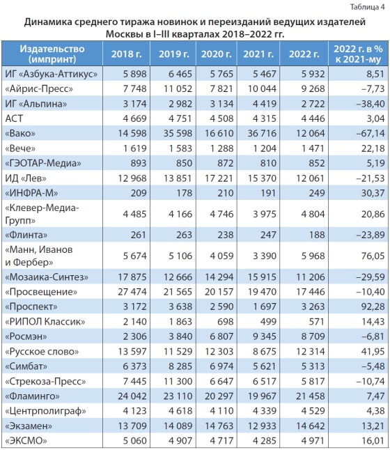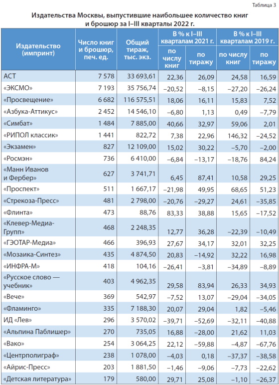 Согласно государственной статистике по итогам трёх кварталов 2022 г., 60% лидеров коммерческого книгоиздания Москвы так и не вернулись по суммарному тиражу к допандемийному уровню. Значимая (8–1%) отрицательная динамика этого показателя не зависит от профиля выпускаемых книг и отмечается как у издателей, специализирующихся на выпуске детской книги («Стрекоза-Пресс», ИД «Лев», «Клевер-Медиа-Групп»), так и у издателей преимущественно художественной и non-fiction литературы для взрослых («Вече», «Азбука-Аттикус», «РИПОЛ классик», «ЭКСМО» и т.д). Впрочем, многие другие издатели детской литературы («Симбат», «Фламинго») или универсалы (АСТ) и даже специализированные издатели («Проспект», «ГЭОТАР-Медиа», «Флинта»), напротив, продемонстрировали значительные восстановительные процессы в 2022 г., увеличив свой выпуск на 25% и более. Серьёзно растут по параметрам выпуска издатели учебной литературы для школ: «Просвещение» и «Русское слово — учебник». Подробная информация представлена в табл. 3.