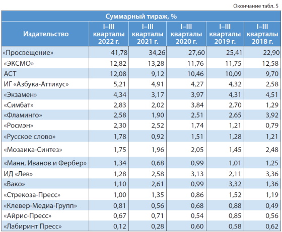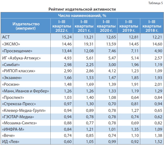 Следует отметить, что агрессивное давление на конкурентное поле со стороны монополий сегодня очевидно прежде всего в учебном и литературно-художественном сегментах книжной отрасли. Напротив, в детском разделе по-прежнему представлены успешные компании малого и среднего бизнеса с сильными командами и возможностью непрерывно инвестировать в продукт и новые технологии. Пример сторонней для издательского бизнеса компании «Симбат» — лучшее тому подтверждение. Кроме того, именно в секторе изданий для детей книжный рынок Москвы знает примеры успешного возвращения в бизнес, несмотря на трудности и даже ликвидацию компании (издательство «Робинс», ИД «Лев»). В целом именно «детские» издательства своим оптимизмом поддерживают потенциал появления новых неординарных проектов на книжном рынке. Динамику доли ведущих издательств в суммарном книжном выпуске Москвы в I–III кварталах 2018–2022 гг. характеризуют данные табл. 5.
