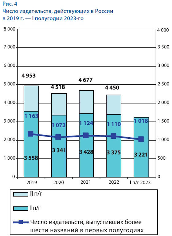 В I полугодии 2023 г., по данным РКП, в стране была зарегистрирована деятельность 3221 издательства, что на 4,6% меньше, чем в аналогичном периоде 2022-го (3375 компаний). Число активно действующих издательств, к которым мы традиционно относим издающие организации, выпускающие в среднем не менее одной книги в месяц (т.е. выпустивших в I полугодии 2023 г. не менее шести названий книг и брошюр), составило 1018. По отношению к I полугодию 2022 г. (1110 издательств) их число сократилось на 8,3% (рис. 4). С сожалением вынуждены констатировать, что и общее число издательств, и количество активно действующих также опустились ниже уровня 2020 г.