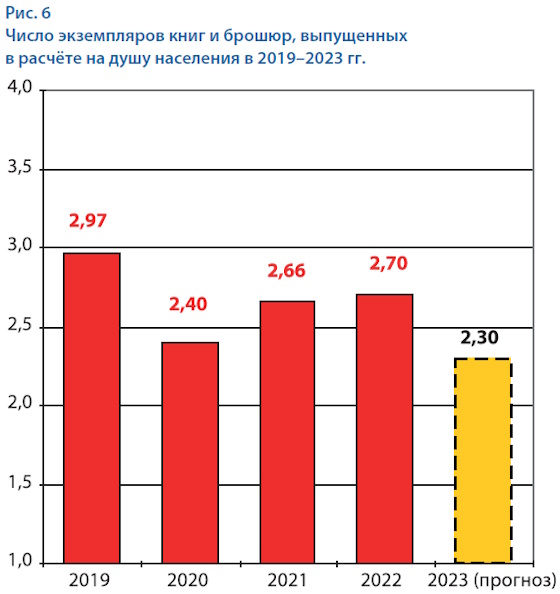 Что касается количества экземпляров книг и брошюр, выпущенных в расчёте на душу населения, то по итогам I полугодия 2023-го картина выглядит следующим образом. Если экстраполировать значение этого показателя, достигнутое в первом полугодии нынешнего года, на второе и полученные данные сложить, то данный показатель за полный 2023 год может составить 2,3 экз. (рис. 6), что не только на 14,8% меньше, чем было по итогам 2022-го (2,7 экз.), но и на 4,2% ниже уровня 2020-го (2,4 экз.).
