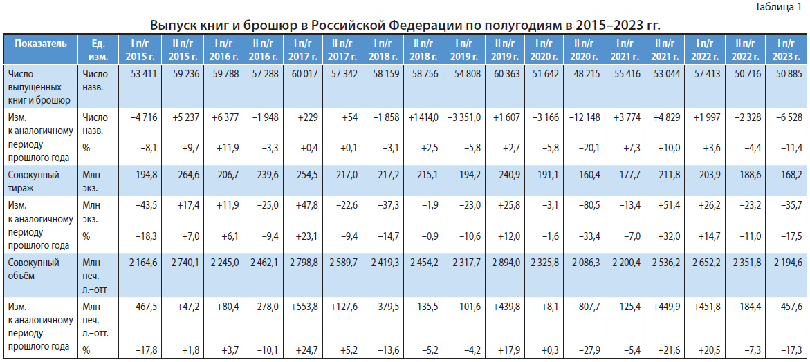 По данным комплекса «Российская книжная палата» Российской государственной библиотеки (РКП РГБ) в I полугодии 2023 г. в России было издано 50 885 названий книг и брошюр общим тиражом 168,2 млн экз. и совокупным листажом 2194,6 млн печ. л.-отт. В сравнении с аналогичным периодом прошлого года число выпущенных в стране названий сократилось на 11,4%, их общий тираж снизился на 17,5%, а совокупный листаж упал на 17,3% (табл. 1, рис. 1–3). Абсолютное число выпущенных в I полугодии 2023 г. названий на 169 единиц превысило показатель II полугодия 2022-го, однако оно всё равно стало одним из худших результатов последнего десятилетия, причём даже на 1,5% ниже показателя I полугодия «ковидного» 2020 г.