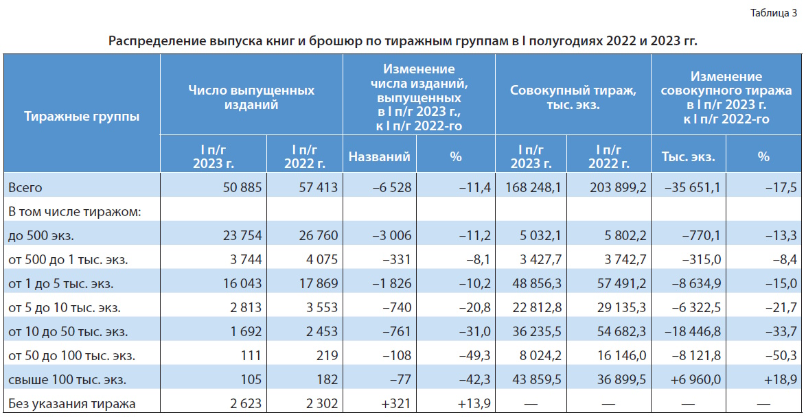 Как видно из таблицы, во всех тиражных группах в I полугодии 2023 г. в сравнении с аналогичным периодом 2022-го наблюдается падение: как по числу выпущенных названий, так и по тиражу, за исключением группы «Свыше 100 тыс. экз.», где рост по тиражу составил 18,9%.